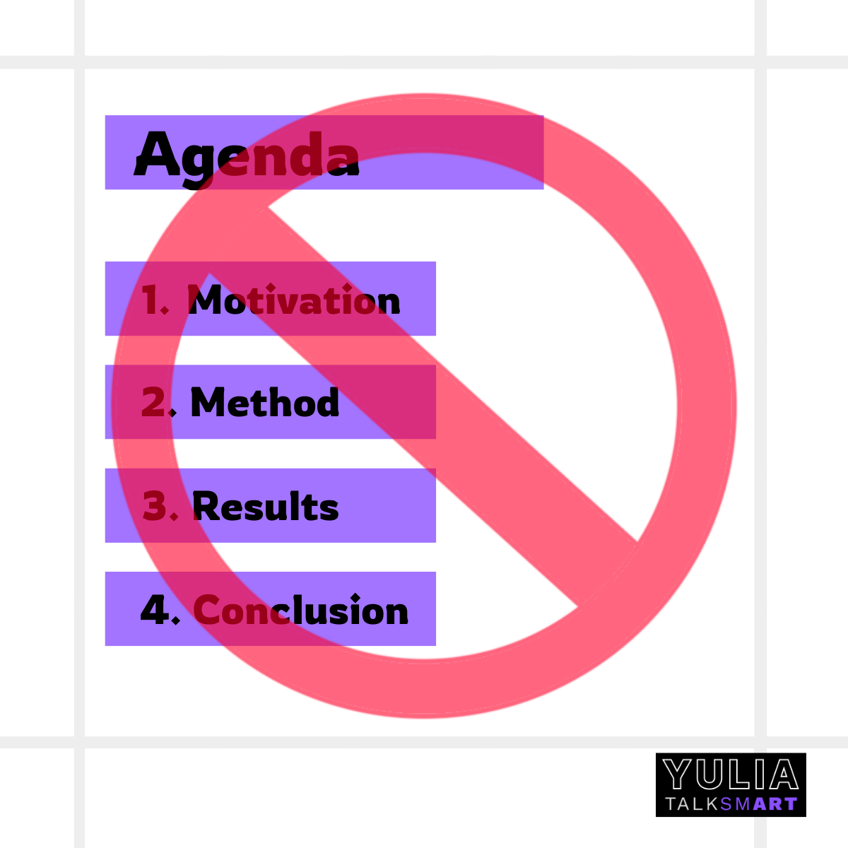 ➡️ If your agenda is typical and predictable (as is often the case in technical presentations), don’t dedicate an entire slide to it during your talk. Most importantly, don’t waste the first minute of your audience’s attention on it. That first minute determines how closely they’ll listen to the rest of your presentation. Spend it wisely.